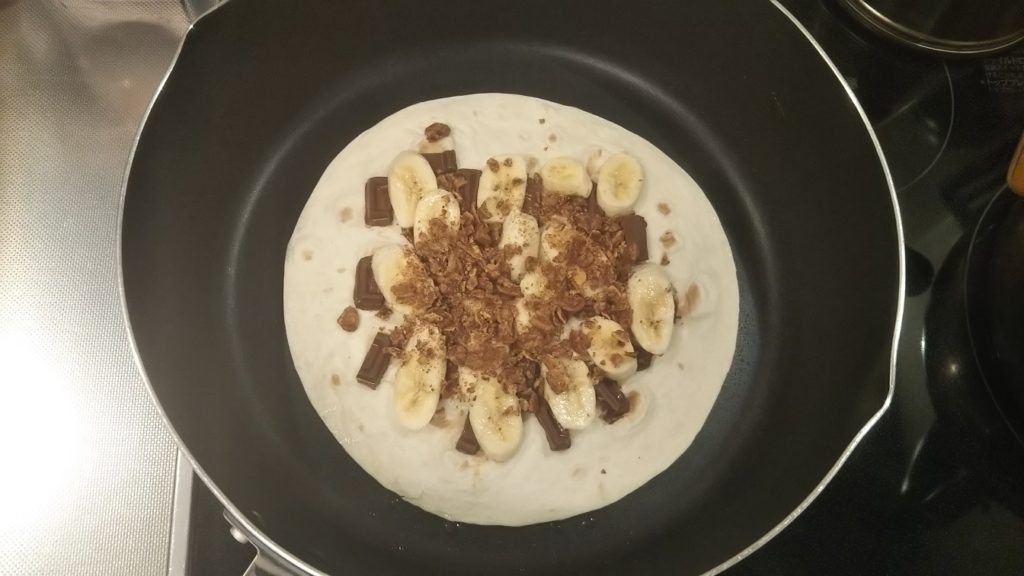 - 具材を乗せて溶かす: 生地が温かいうちに、板チョコをパラパラと乗せます。 さらに弱火で1分30秒ほど加熱。生地の熱でチョコが「トロッ」と溶けてきたら、その上にバナナとシリアルを乗せます。
